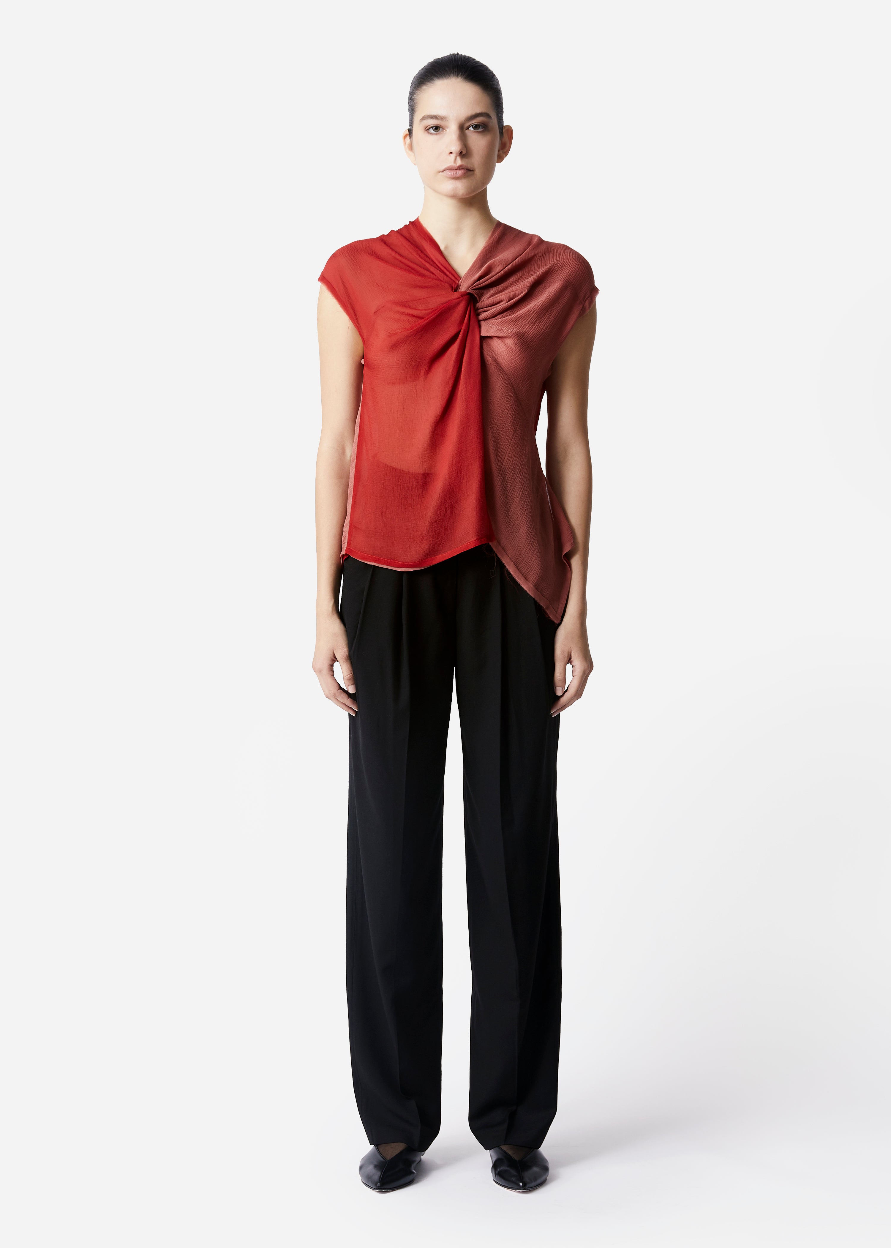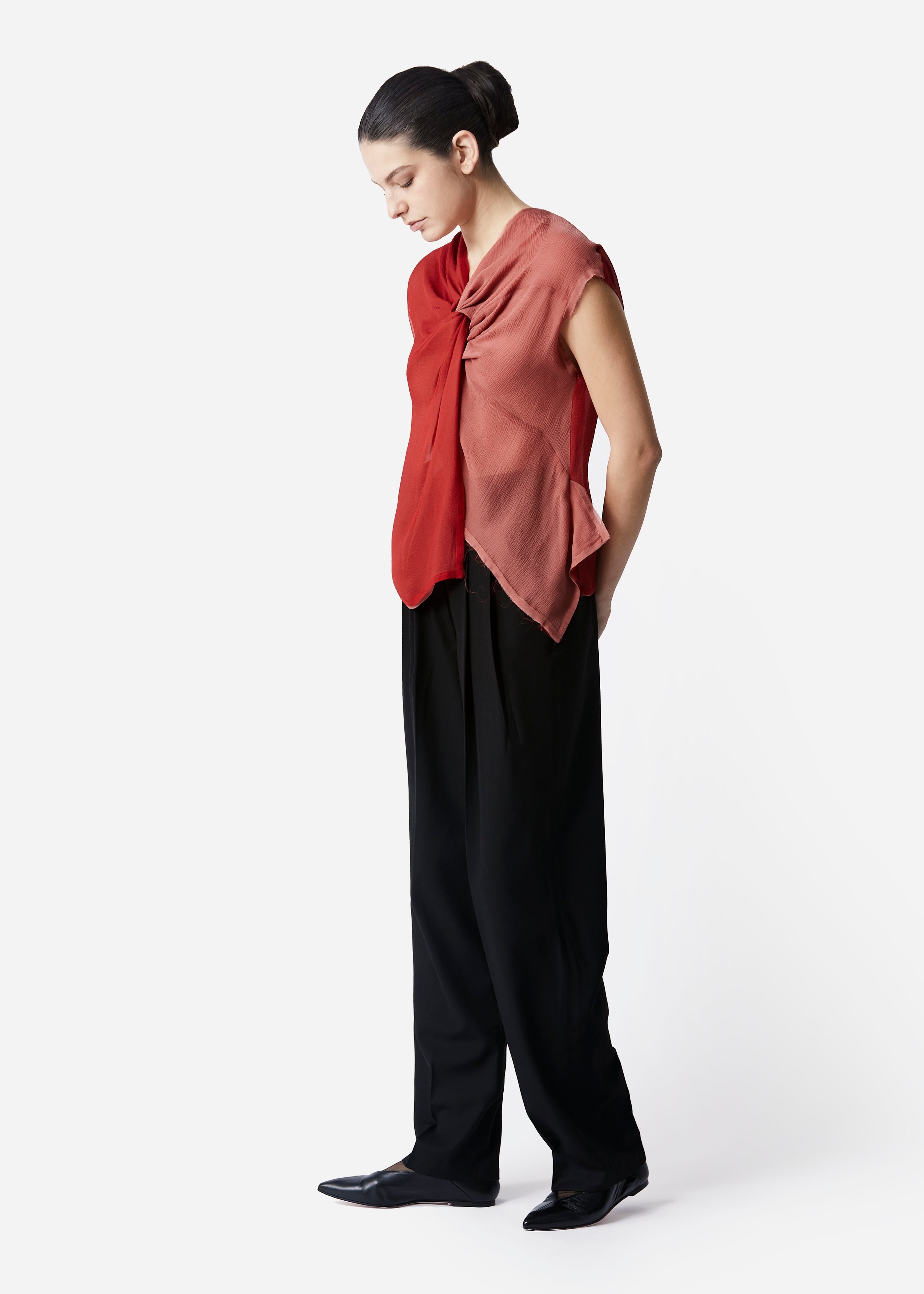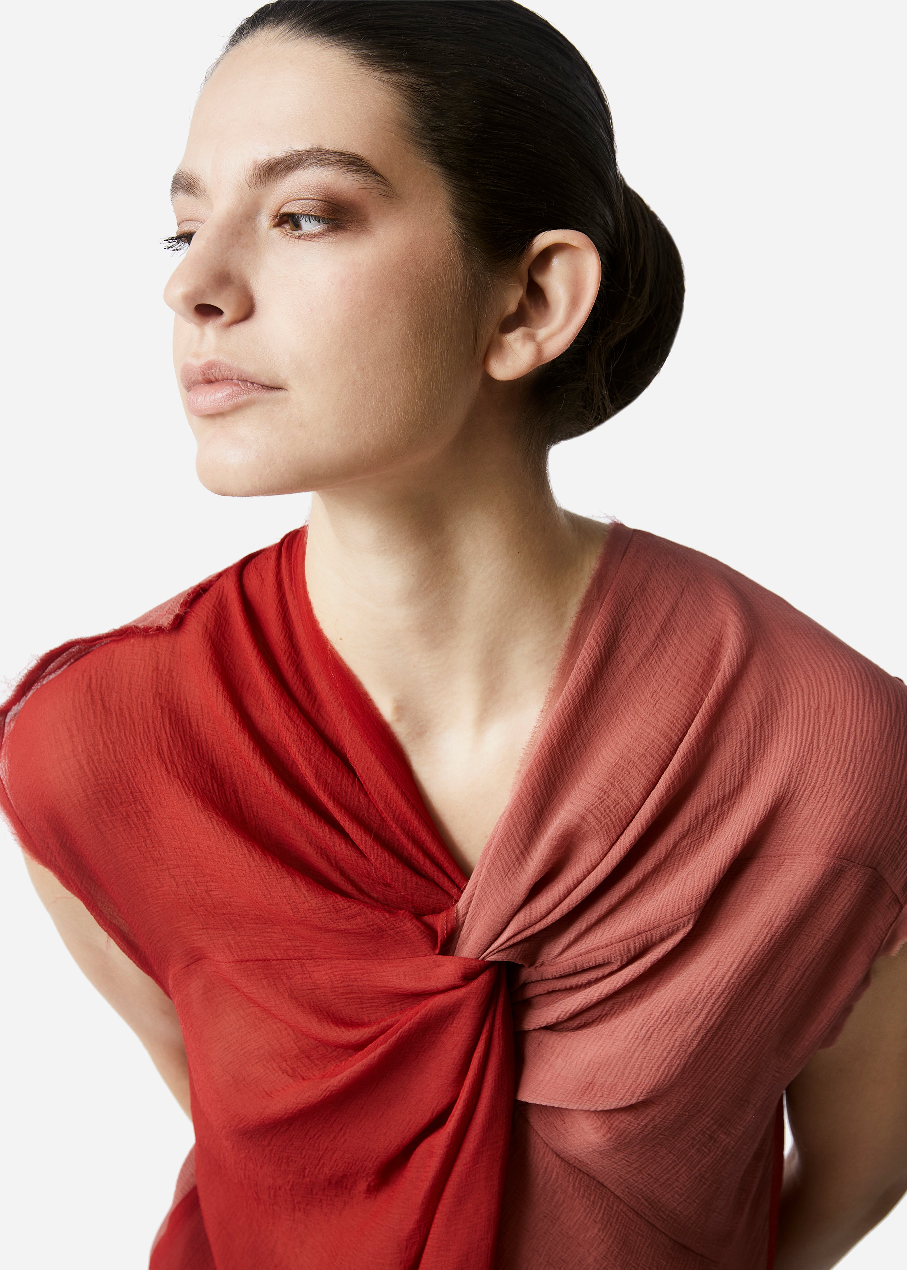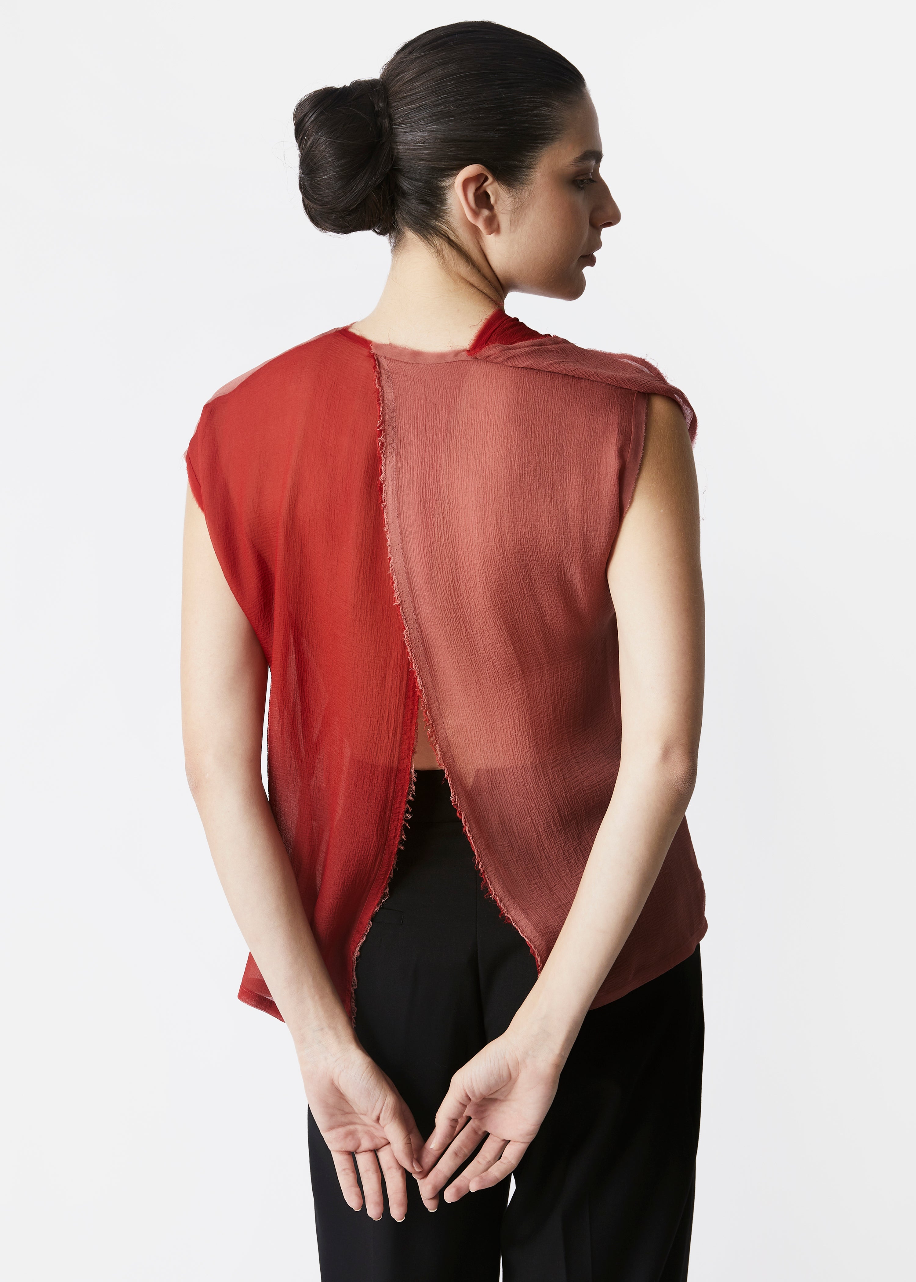 TOP 01 is made from contrasting silk in dusty pink and red which is double-layered and semi-transparent. It features a front twist detail and a draped back which naturally falls open, finished with crafted raw edges and our signature selvedge finish.