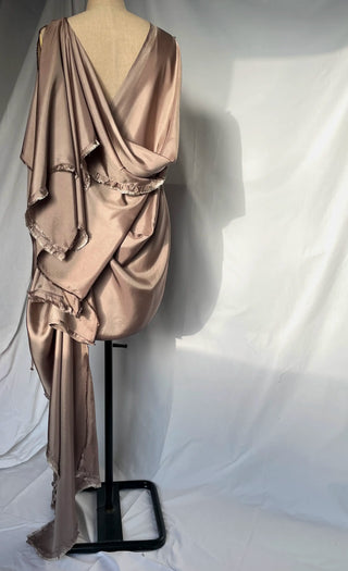 Honouring draping as an art form and reflecting on past traditions, each roll of fabric is elegantly draped into a beautiful piece of clothing. Inspired by Neo-Classical and Helenistic art movements, historical cultural robes, and knots, the fabrics are majestically wrapped and tied around the body, combining contrasting materials and colours, leaving you with an expression of ultimate elegance.
